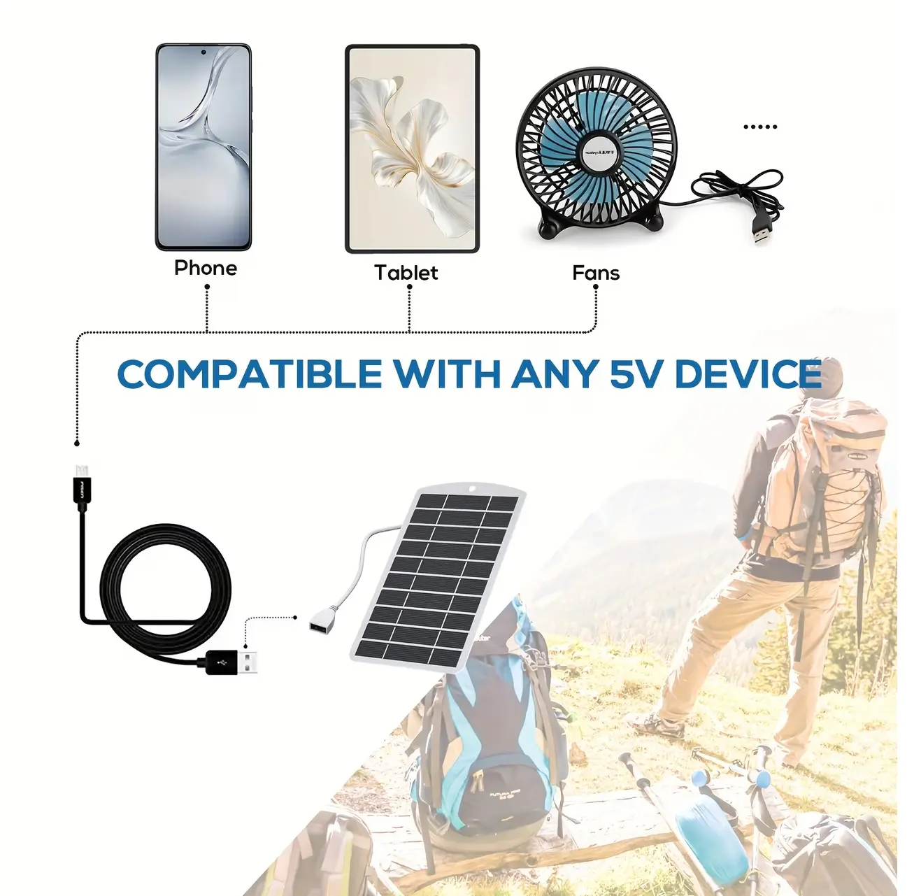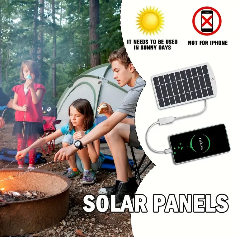 Портативная солнечная панель для зарядки гаджетов — энергия природы в твоем распоряжении Будь то поход в горы, путешествие на байдарке, экспедиция или просто отдых на даче — эта компактная солнечная панель обеспечит заряд там, где нет розеток и цивилизации. Легкая, влагостойкая и удобная в использовании, она быстро станет незаменимым спутником в любой поездке Солнечная панель крепится к рюкзаку или палатке двумя карабинами, не занимает много места и весит всего 250 граммов. Она предназначена для зарядки мобильных устройств, пауэрбанков, наушников и других USB-устройств. Встроенный регулятор стабилизирует напряжение и делает зарядку безопасной и эффективной. Работает даже в условиях низкой освещенности Монокристаллические элементы обеспечивают высокую эффективность преобразования солнечной энергии, что особенно важно в полевых условиях.