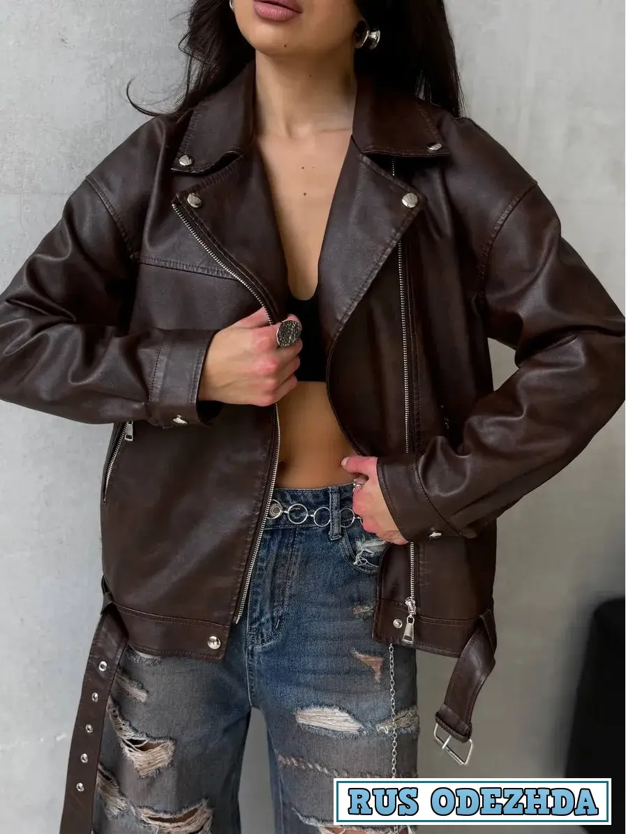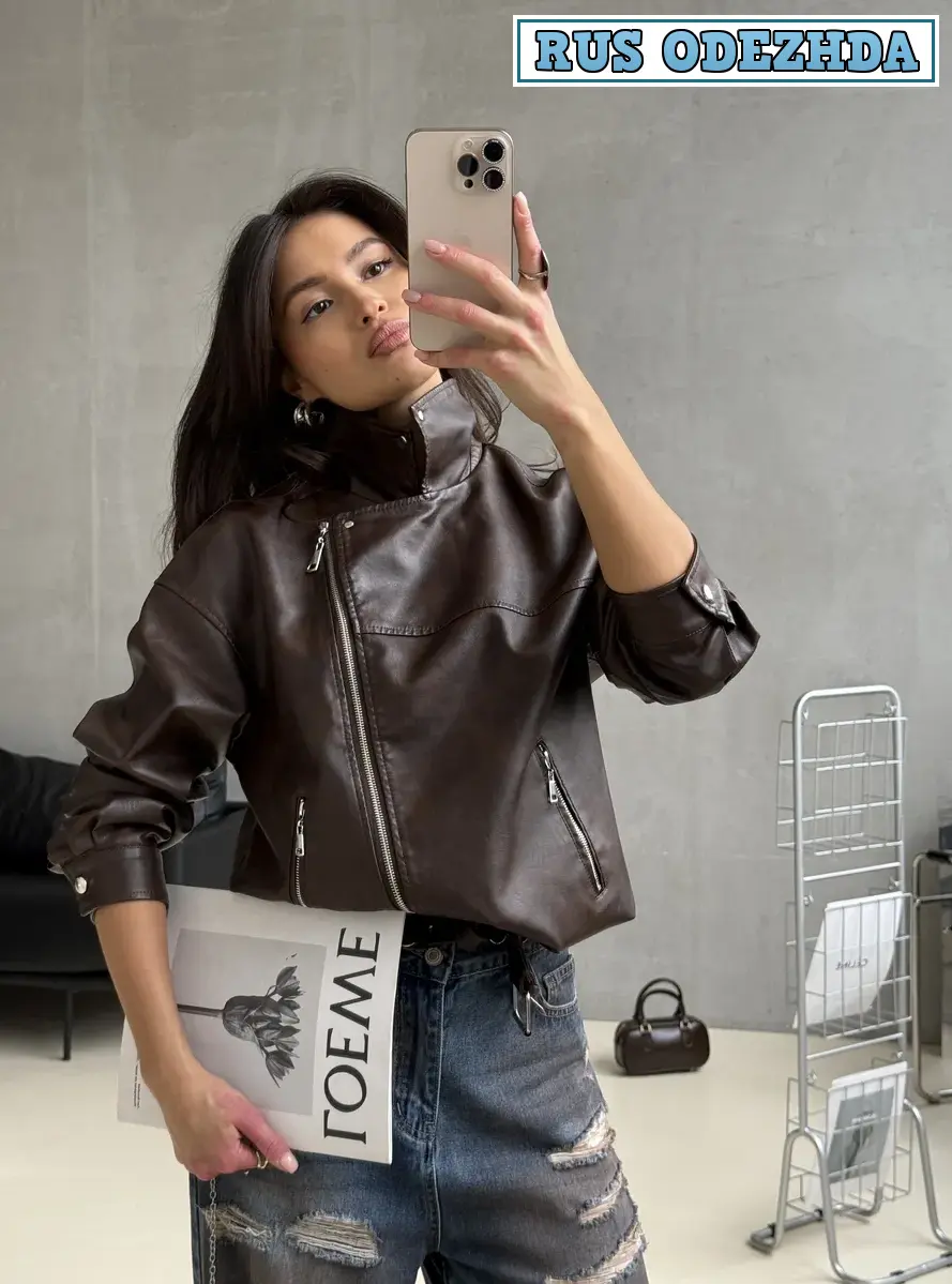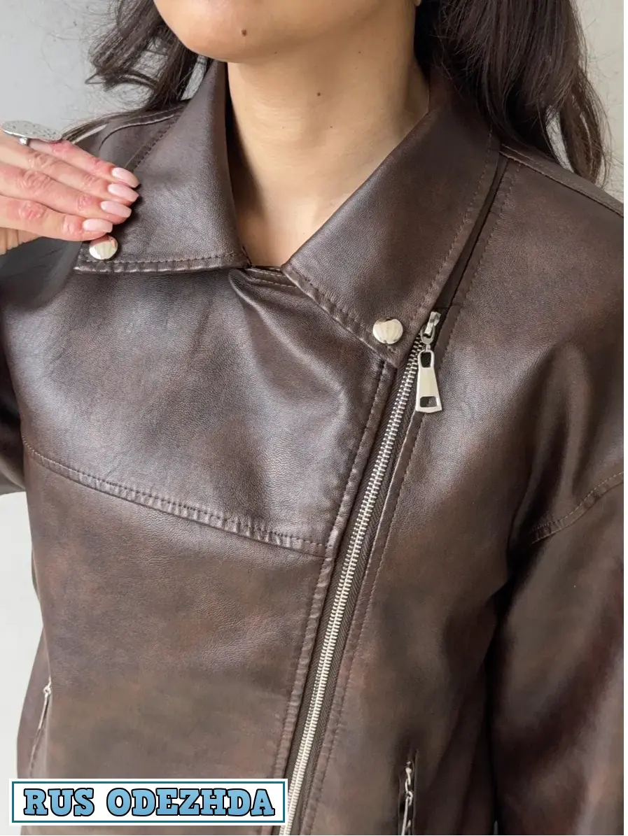 Представляем вашему вниманию: стильная женская косуха из экокожи, идеальный выбор для модниц, ценящих комфорт и элегантность. Эта коричневая легкая кожаная куртка станет незаменимой частью вашего гардероба в период весна - лето и осень. Изготовленная из высококачественного кожзам, она сочетает в себе современный стиль и винтажный мотив.