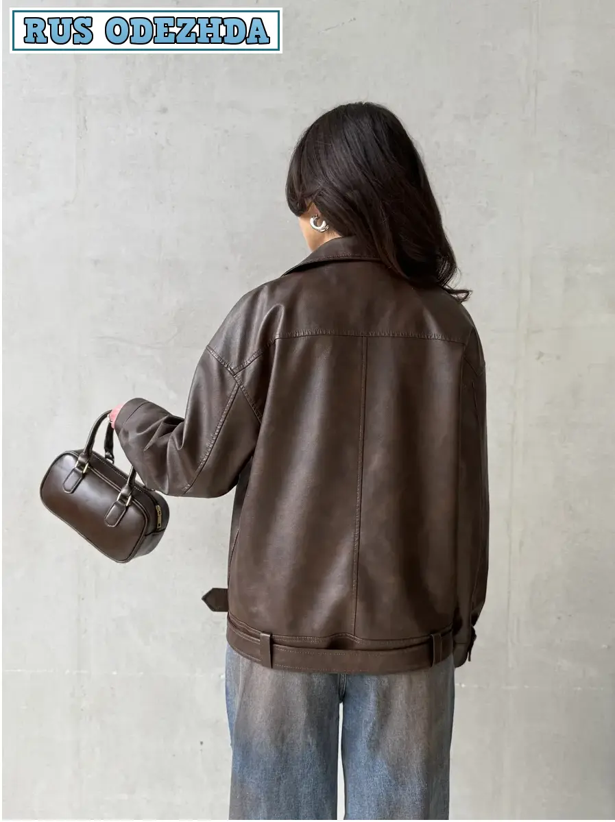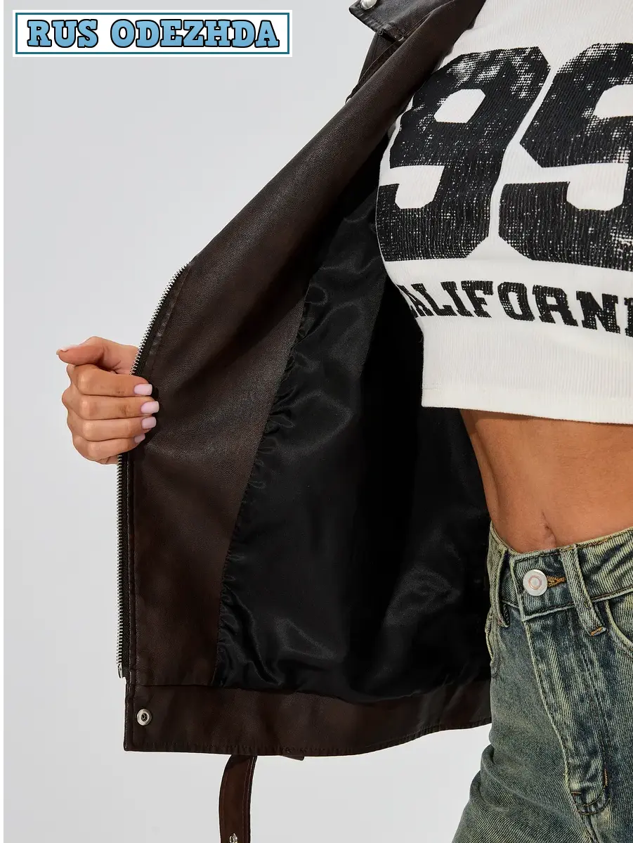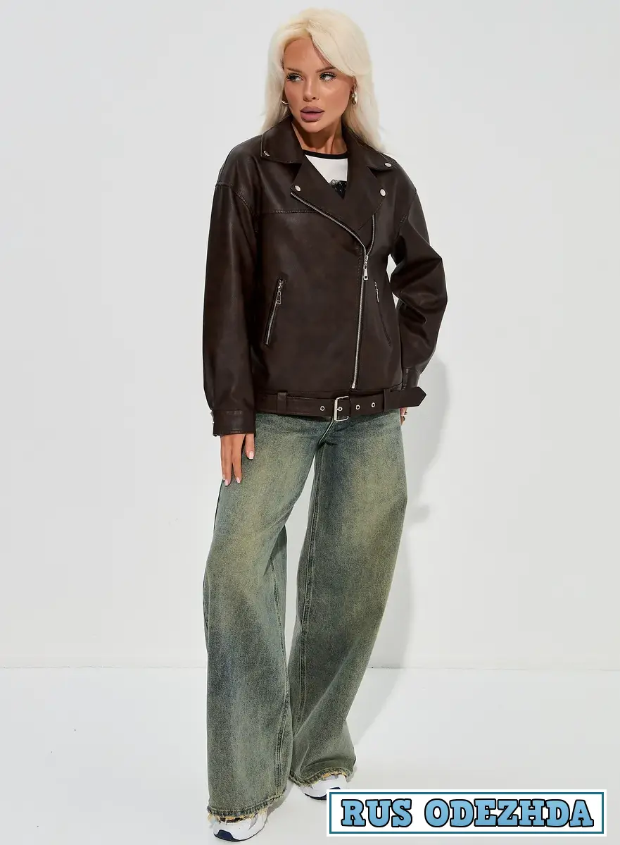 Представляем вашему вниманию: стильная женская косуха из экокожи, идеальный выбор для модниц, ценящих комфорт и элегантность. Эта коричневая легкая кожаная куртка станет незаменимой частью вашего гардероба в период весна - лето и осень. Изготовленная из высококачественного кожзам, она сочетает в себе современный стиль и винтажный мотив.