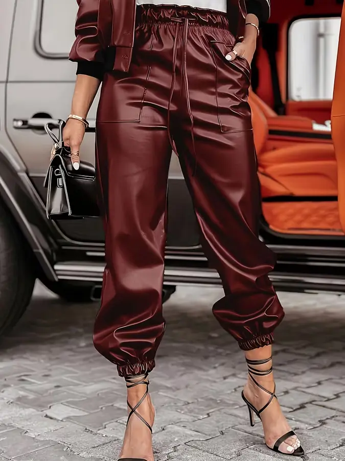 Куртка женская кожаная с кожаными брюками — стильная одежда для женщин, отлично подходящая как демисезонная куртка для весны, осени и лета. Куртка с кожаными брюками выполнена из мягкой премиум искусственной кожи, что делает ее этичной альтернативой натуральной коже.