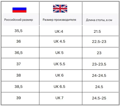 Размеры: 4 / 4.5 / 5 / 5.5 / 6 / 6.5 / 7 (размеры английские)