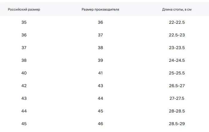 Доступные размеры (российские размеры): 35 36 37 38 39 40 41 42 43 44 45